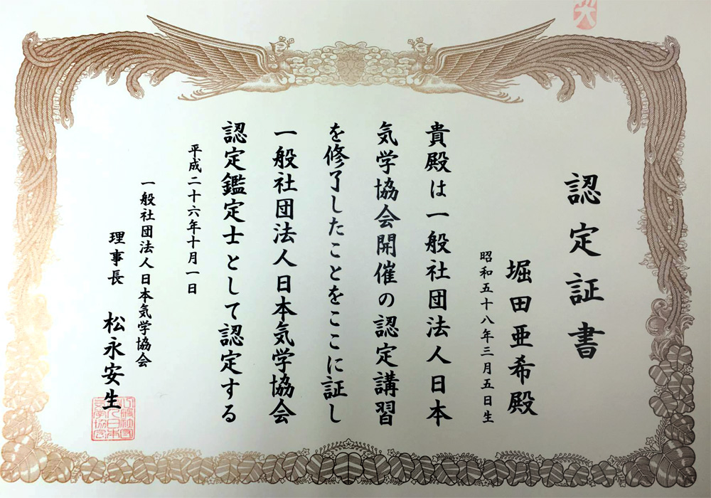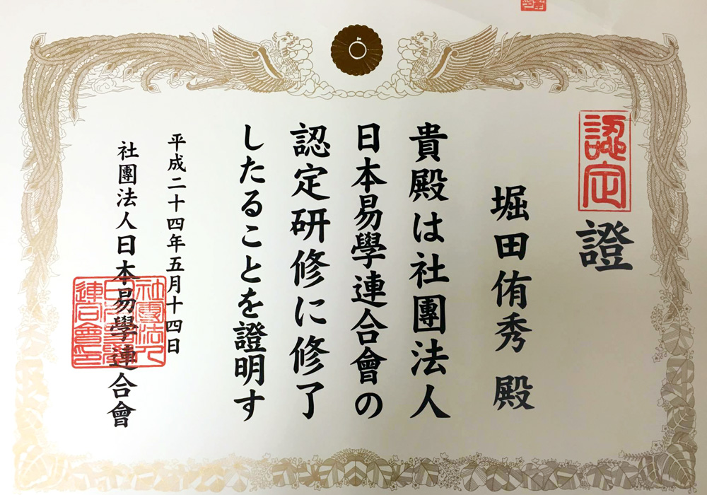 日本国で認められている唯一の占いの会、公益社団法人日本易学連合会の鑑定士の試験を突破し、認定鑑定士を受けております。